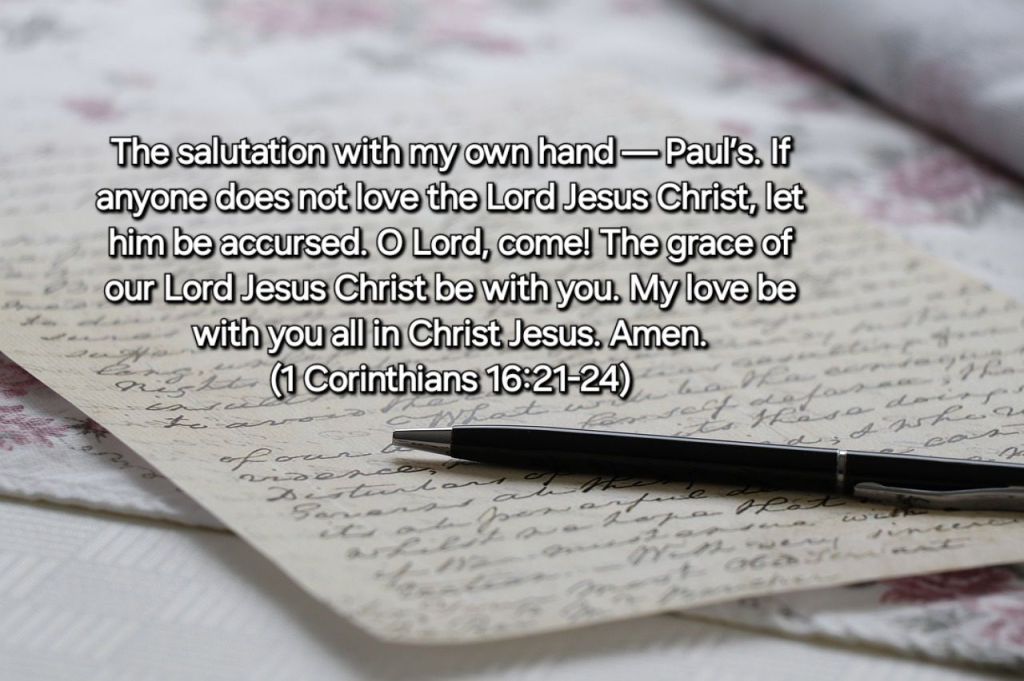 In these closing words of 1 Corinthians, we see Paul’s deep love for both Jesus and the church. His personal note, written with his own hand, underscores the sincerity of his message and the authenticity of his relationship with Christ. This final greeting reveals Paul’s conviction about the importance of loving Jesus genuinely. His bold statement—“If anyone does not love the Lord Jesus Christ, let him be accursed”—reminds us that true commitment to Christ is grounded in love.