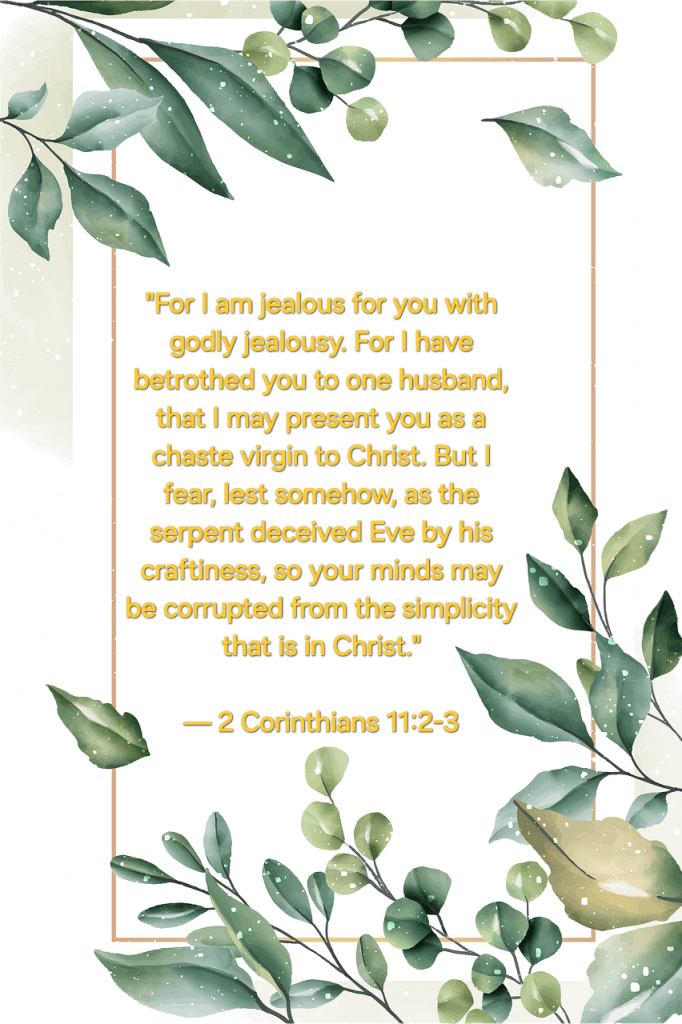 “For I am jealous for you with godly jealousy. For I have betrothed you to one husband, that I may present you as a chaste virgin to Christ. But I fear, lest somehow, as the serpent deceived Eve by his craftiness, so your minds may be corrupted from the simplicity that is in Christ.”