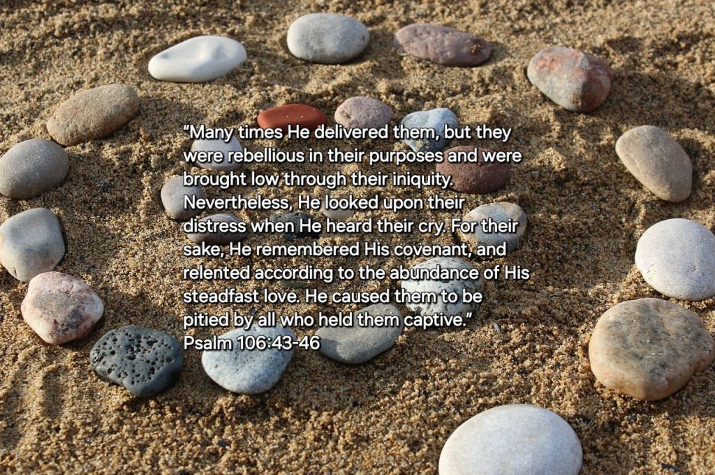 “Many times He delivered them, but they were rebellious in their purposes and were brought low through their iniquity. Nevertheless, He looked upon their distress when He heard their cry. For their sake, He remembered His covenant, and relented according to the abundance of His steadfast love. He caused them to be pitied by all who held them captive.” — Psalm 106:43-46